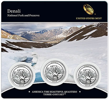 Three-coin sets contain three collectible America the Beautiful Quarters of the national park or national site they honor. Denali sets have a 2012-S proof quarter, a 2012-P uncirculated quarter and a 2012-S uncirculated quarter that are held in an attractive durable plastic card featuring an image of Denali National Park in Alaska.