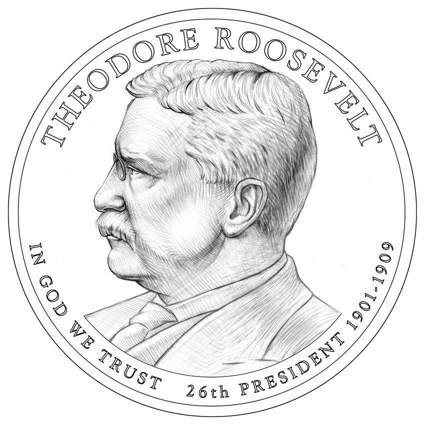 Theodore Roosevelt’s portrait was designed and executed by United States Mint Sculptor-Engraver Joseph Menna. Around the portrait are the inscriptions THEODORE ROOSEVLET, IN GOD WE TRUST, 26th PRESIDENT and 1901 – 1909.