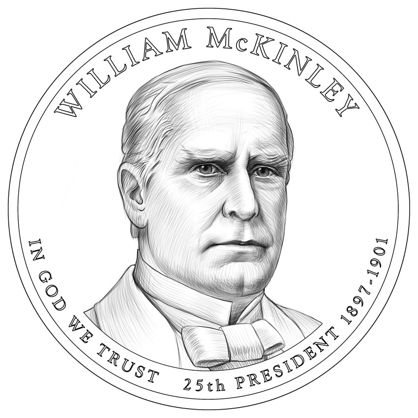 William McKinley’s portrait was designed and executed by United States Mint Sculptor-Engraver Phebe Hemphill. Surrounding the design are the inscriptions WILLIAM MCKINLEY, IN GOD WE TRUST, 25th PRESIDENT and 1897 – 1901.