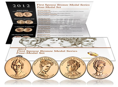 The 2012 First Spouse Bronze Four-Medal Set is available online at the U.S. Mint website (http://catalog.usmint.gov/) and toll-free number 1-800-USA-MINT (872-6468).