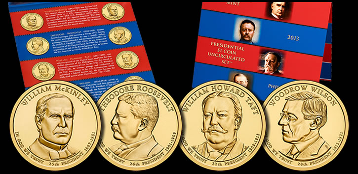 The sets are in their seventh year of issue. The first one debuted in 2007 when the Presidential $1 Coin Program was introduced to honor former Presidents of the United States. This latest uncirculated set has eight coins with four from the Philadelphia Mint and four from the Denver Mint. The 2013 Presidential $1 coins include: