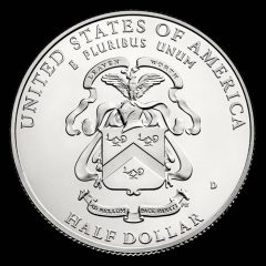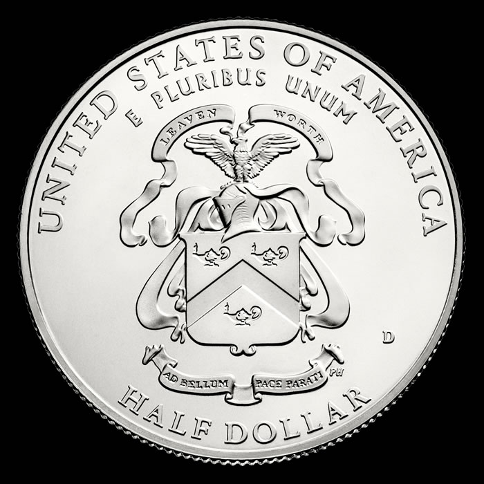 The heraldic crest of Fort Leavenworth is shown on the reverse. Inscriptions are UNITED STATES OF AMERICA, E PLURIBUS UNUM and HALF DOLLAR. Hemphill is also responsible for the design and execution of the reverse.