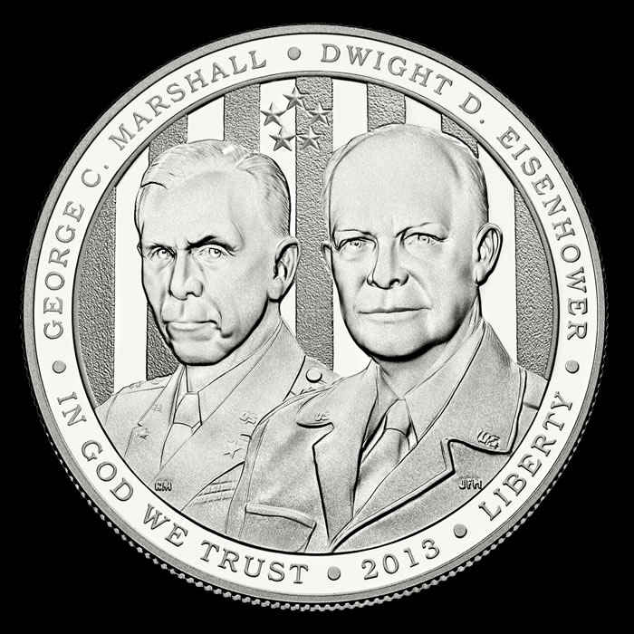 On the obverse are portraits of Generals George C. Marshall and Dwight D. Eisenhower. Inscriptions include GEORGE C. MARSHALL, DWIGHT D. EISENHOWER, IN GOD WE TRUST, 2013 and LIBERTY. AIP Master Designer Richard Masters designed the obverse, and Joseph Menna was in charge of execution.