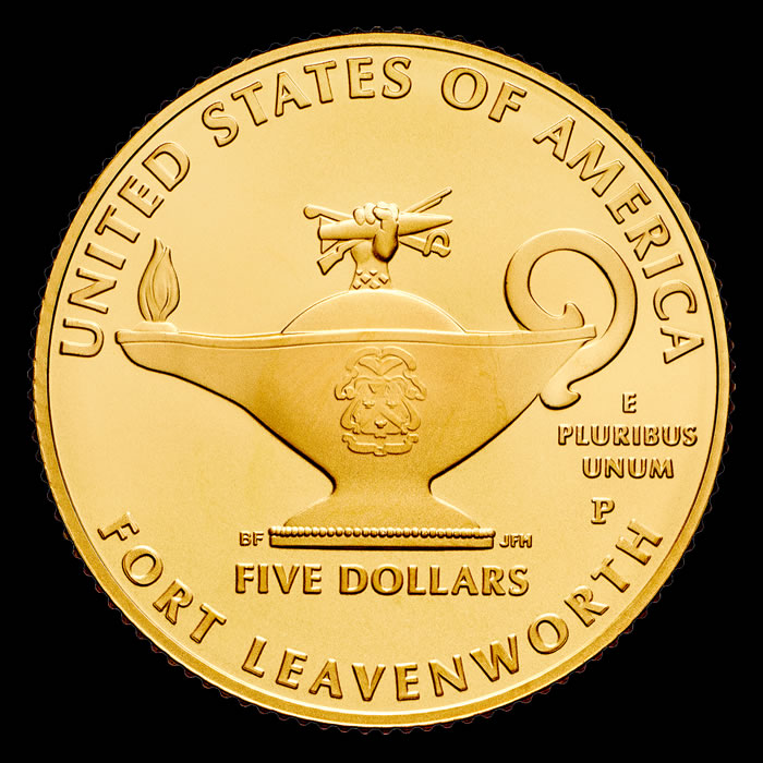 The reverse features a depiction of the Leavenworth Lamp, the symbol of the CGSC. Inscriptions include UNITED STATES OF AMERICA, E PLURIBUS UNUM, FIVE DOLLARS and FORT LEAVENWORTH. AIP Master Designer Barbara Fox designed the reverse image with United States Mint Sculptor-Engraver Joseph Menna in charge of execution.