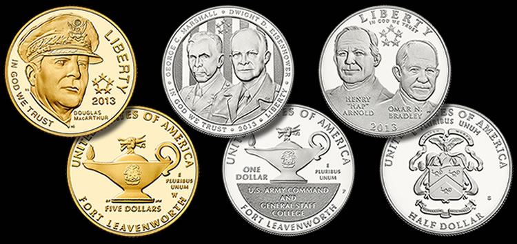 Struck in uncirculated and proof qualities, the commemoratives honor five United States Army 5-star generals and celebrate the 132nd anniversary of the founding of the United States Army Command and General Staff College (CGSC).