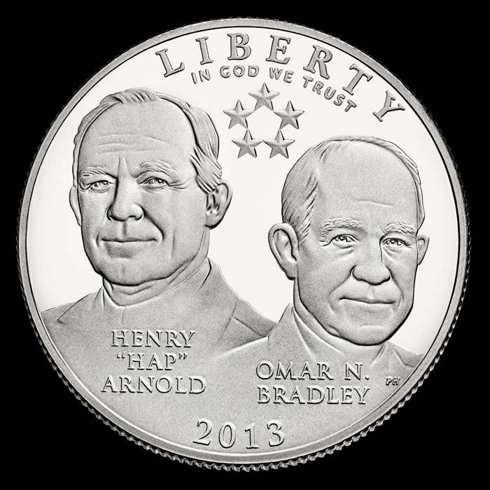 Obverses of the clad half-dollar showcase the portraits of Generals Henry "Hap" Arnold and Omar N. Bradley. Inscriptions include LIBERTY, IN GOD WE TRUST, HENRY "HAP" ARNOLD, OMAR N. BRADLEY and 2013. U.S. Mint Sculptor-Engraver Phebe Hemphill designed and was in charge of execution for the obverse.