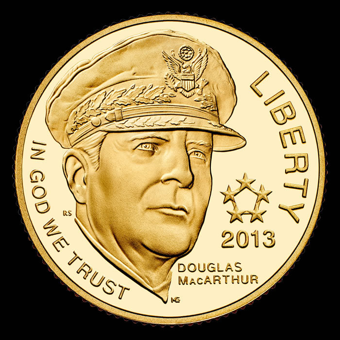 On the obverse of the gold coin is a portrait of General Douglas MacArthur and the 5-star insignia. Inscriptions include IN GOD WE TRUST, DOUGLAS MACARTHUR, 2013 and LIBERTY. The design was completed by United States Mint Artistic Infusion Program (AIP) Associate Designer Ronald D. Sanders with United States Mint Sculptor-Engraver Michael Gaudiso executing.