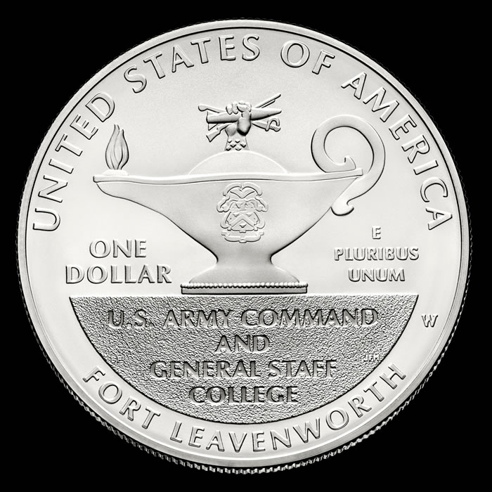 The Leavenworth Lamp with the heraldic crest of Fort Leavenworth is depicted on reverses along with the inscriptions of UNITED STATES OF AMERICA, ONE DOLLAR, E PLURIBUS UNUM, U.S. ARMY COMMAND AND GENERAL STAFF COLLEGE and FORT LEAVENWORTH. Barbara Fox designed the reverse and Joseph Menna was in charge of sculpting it.