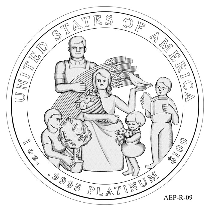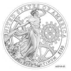 "The Committee strongly recommended design AEP-03 showing "Young America" symbolized in the form of an elegant young woman contrasted against images of interlocking gears emblematic of the unique workings of the state and federal governments of the United States in promoting the general welfare of the nation. The design garnered 28 of the 30 possible points through the Committee’s scoring process. Members commented on the well balanced composition of the design, the successful balance of image and negative space and that it would create a beautiful and fitting image for the reverse of the coin."