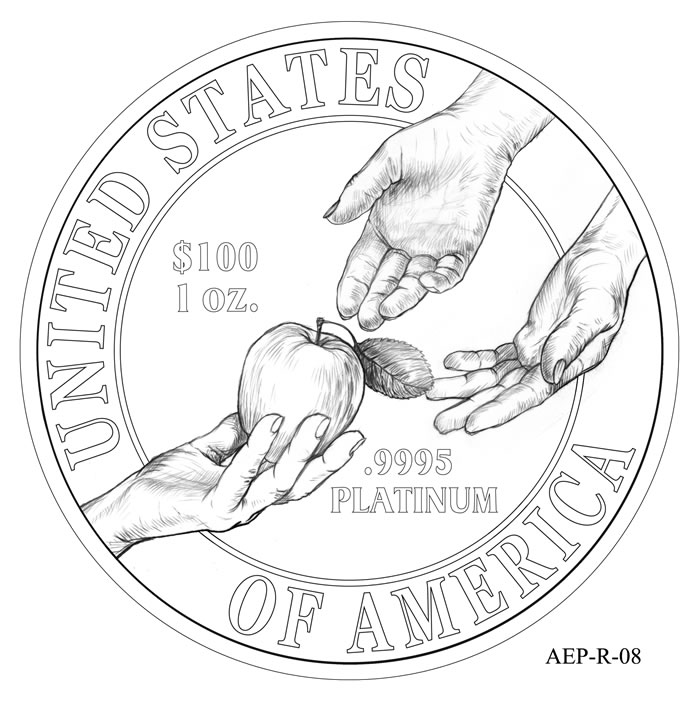 "The Commission members expressed appreciation for including images of the recent issues of platinum eagle coins in the presentation; they recommended alternative #2 as the most appropriate design when considered with the previous coins of the series. Consistent with their continuing preference for simplicity in the design of coins and medals, they recommended removal of the horizon line and the ring of stars from the right side of the composition."