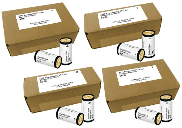 A sticker on the top of each box describes its contents in the following way: "2013 Presidential $1 Coin," "Theodore Roosevelt," "UNITED STATES MINT" and "www.usmint.gov." Also noted are the face value of either "$250" or "$500" and the mark of "P" or "D".