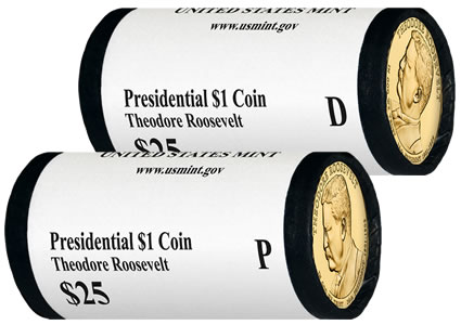 Theodore Roosevelt dollars are offered in a roll of 25 coins for $32.95. Collectors have their choice of which U.S. Mint facility the coins came from, Philadelphia or Denver.