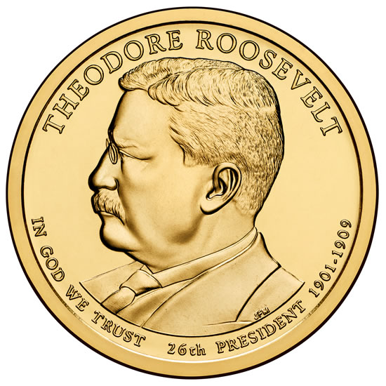 Obverse designs of Theodore Roosevelt’s Presidential $1 Coins bear an image of President Roosevelt by United States Mint Sculptor-Engraver Joseph Menna. Inscribed on this side of the coin is "THEODORE ROOSEVELT," "IN GOD WE TRUST," "26th PRESIDENT" and "1901 – 1909."