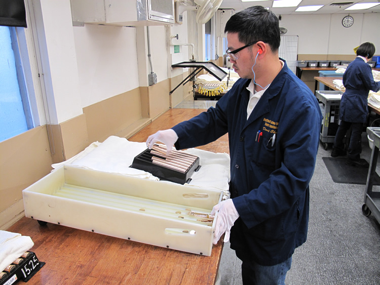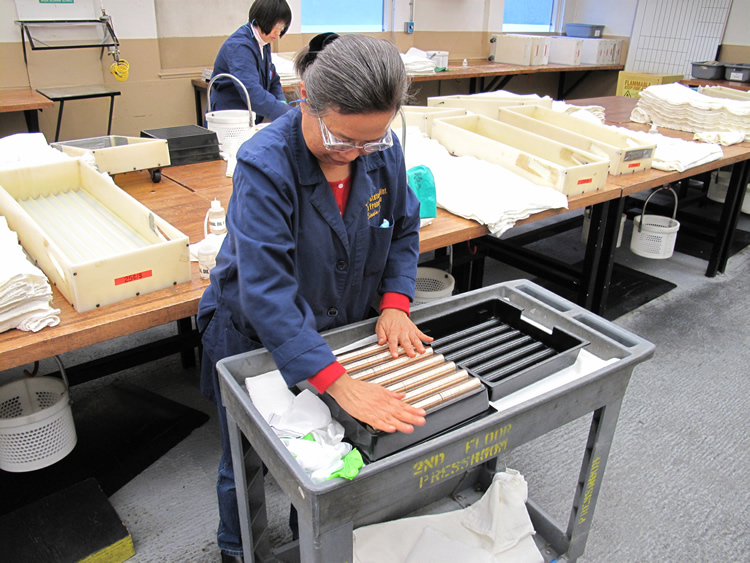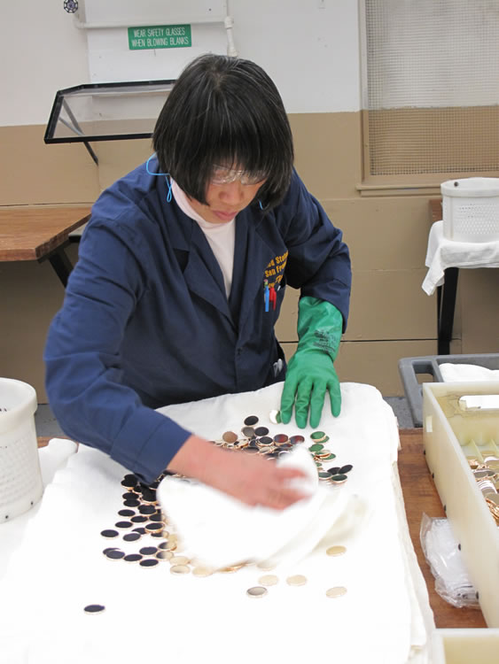 In a large L-shaped area that San Francisco Mint employees call the Coining Press Room, there are nearly 20 presses lined up against walls. But before blanks get to them, they first receive some special attention. Though they have already been through the Treatment Room, the blanks are manually washed, dried and buffed. That’s quite an undertaking with the millions of proofs minted each year.