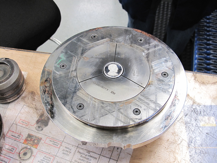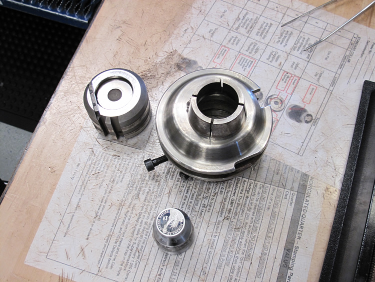 If you look closely at the photos directly above and below, you’ll notice the reverse die at top center and the obverse die at bottom center.