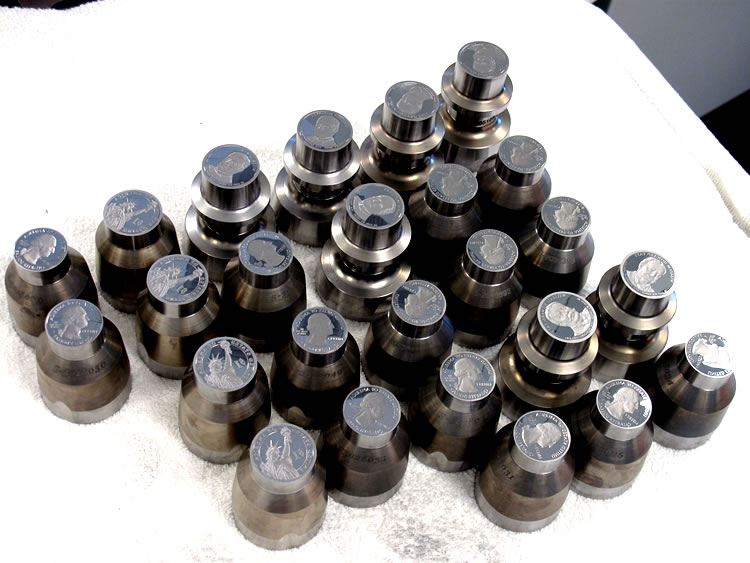 Specially designed tooling kits are used to house dies which then fit inside coin presses.