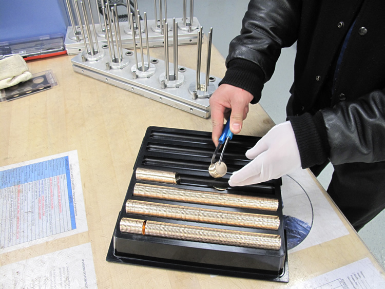 With trays of proof coins readied, they will move to the packaging room for automatic placement into plastic lenses to create proof sets.