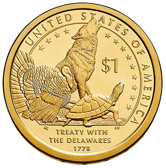 CoinNews.net reported on the dollar’s design a few months ago. This year’s strike commemorates "The Delaware Treaty (1778)," and fittingly features a turkey, howling wolf, and turtle on the reverse. Those are clan symbols of the Delaware Tribe.