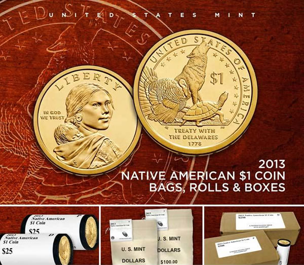 Labeling shows “2013 Native American $1 Coin,” “$25,” and either a “P” or a “D” to indicate the city of origin. Also written is, “UNITED STATES MINT” and “www.usmint.gov.”