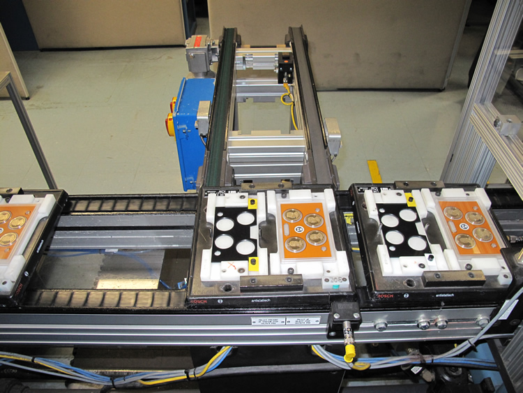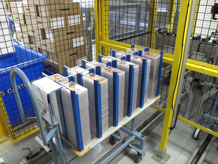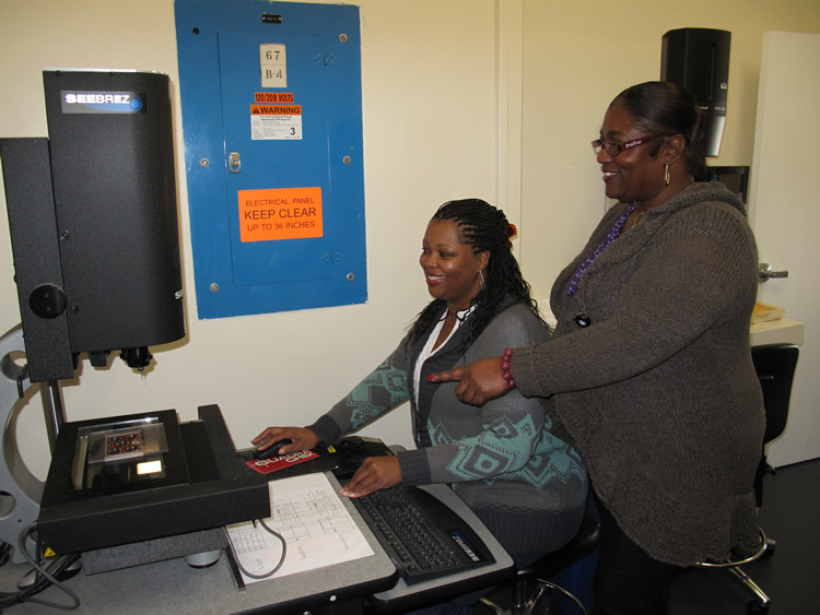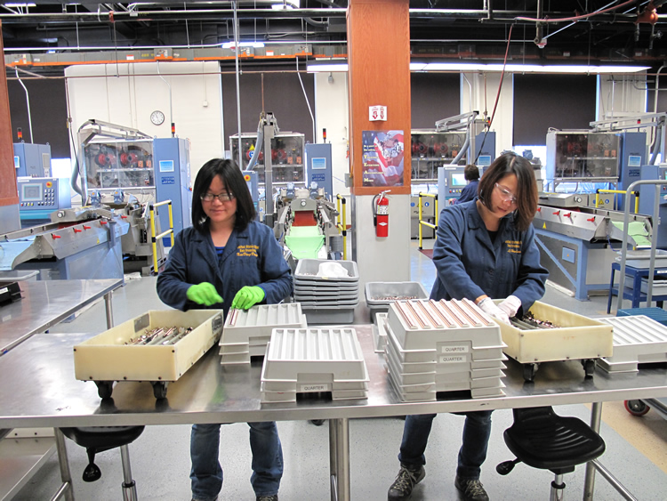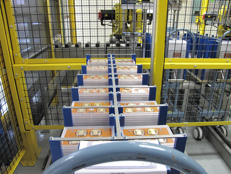Don Bishop operating packaging linePresidential lenses being assembled on packaging lineCoins being inspected on packaging lineAutomated packaging line – up to 80,000 lenses per day can be producedRobert Medrano operating packaging lineGarfield Kincross colleting lenses at the end of the packaging lineLenses awaiting final cartoningLenses with cartoning machine’s robot arms in the backA portion of the cartoning line – Primary Carton AssemblyInternal view of cartoning lineA portion of the cartoning line – Case PackerFinished Proof Set Cartons at SF MintInsertion of finished cartons into shipping containerMicky Fernandes, U.S. Mint, MetallurgistExploded view of a blank used by San Francisco Mint’s metallurgistJonathan Okorley performing a chemical analysis of silverQuality Assurance Lab showing chemical analysis equipmentChemical Exhaust HoodsInspection station for measuring productClose-up of machine used to measure product, in this case a lenseLaTonia Johnson and Loretta Dickerson operating inspection machine