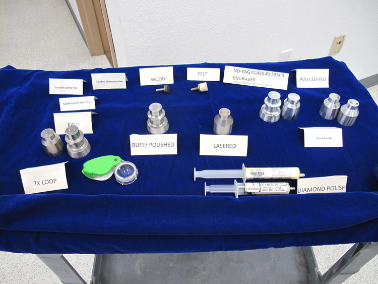 Two obverse coin dies for 2013 Proof America the Beautiful Quarters and four reverse coin dies for 2013 Proof Presidential $1 CoinsVarious tools used in the die polishing processYin Lau polishing proof diesYin Lau polishing a proof America the Beautiful Quarter dieLaser engraving is used to apply frost to achieve cameo appearance on proof coinsMonte Bolmer operating laser engraving machineActual die being laser engravedRobert Nyein preparing Physical Vapor Deposition (PVD) Chamber in Clean Room. The PVD Chamber is an environmentally safe method to chrome plate dies which extends their usage. Before entering the area, you dawn disposable garments in a vented room to control contaminants.Robert Nyein adds dies to PVD ChamberNyein operating PVD ChamberInside Physical Vapor Deposition ChamberSeveral coin dies in PVD Chamber