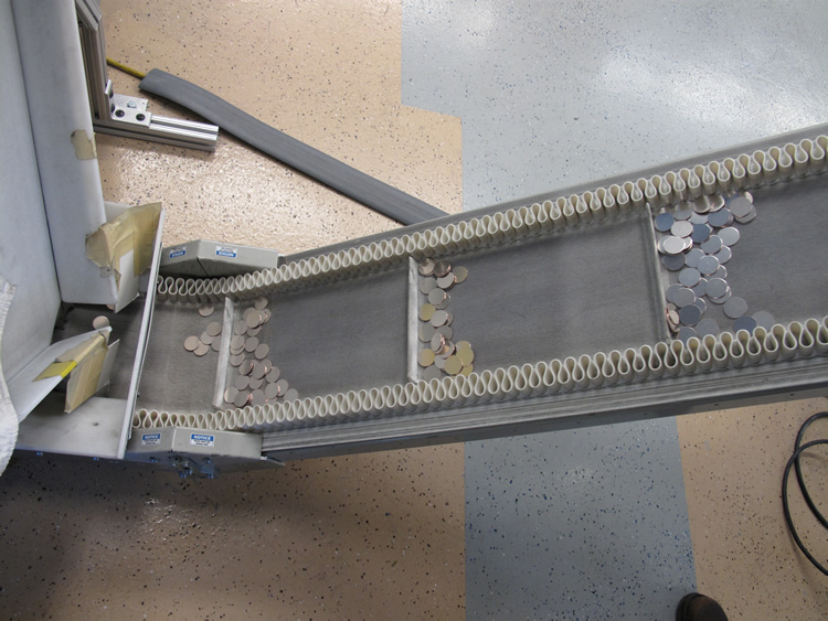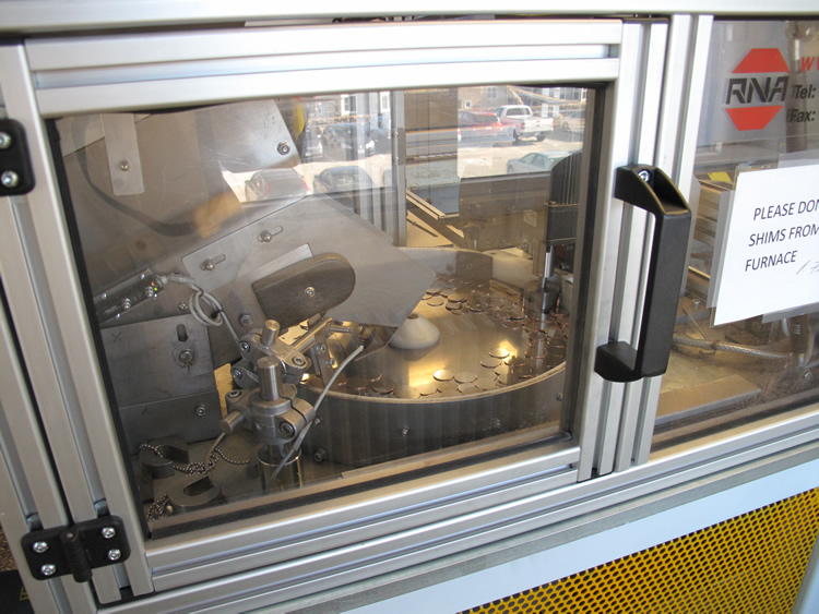 Large furnace used to anneal coinage blank material (Tom Jurkowsky in background)Annealing furnace blank feederConveyor transporting blanks from furnace to binsOld Annealing Furnace. Department of the Treasury. Bureau of the Mint. U.S. Mint, San Francisco, California. (1873 – 07/11/1962)Upsetting mill which puts a rim effect around the blankFrom the Upset Mill blanks are conveyed to a binBurnishing Mill used to clean, shine and prepare blanksBurnishing processThe burnishing bowl drop its contentsAfter burnishing, blanks are conveyed onto a drying beltAlong with the drying belt are drying towels placed on the path taken by the blanks to the collecting binBurnished and dried blanks are conveyed into a storage bin where they are later collected and rackedBlanks are racked into racking trays Xie Deng (left) Li Han Chan (right)