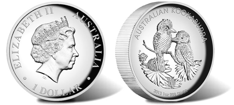 Inscriptions on the design include AUSTRALIAN KOOKABURRA, 2013, 1 oz 999 SILVER and the Perth Mint’s ‘P’ mint mark. This reverse image was created by Perth Mint artist Natasha Muhl. The obverse of the coin includes a portrait of Queen Elizabeth II by Ian Rank-Broadley. Obverse inscriptions surrounding the portrait include ELIZABETH II, AUSTRALIA and 1 DOLLAR.