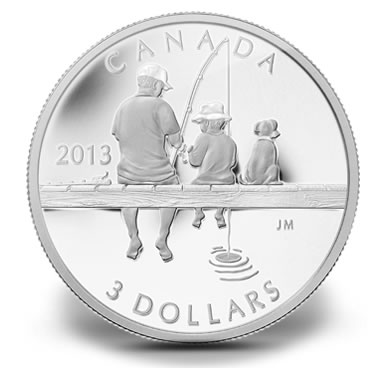 Designed by Canadian artist John Mantha, the silver coin’s reverse shows a father and child fishing from a dock with their dog happily to their side. The father, garbed in cap, t-shirt and shorts, appears handing his child a readied fishing rod. The two have their bare feet dangling just above water that’s rippling around the line. The family dog sits beside the two with ears perked, looking out across the water. Inscriptions surrounding the image include "CANADA," the date "2013," the coin’s legal tender face value of "3 DOLLARS" and "JM" for the designer’s initials.