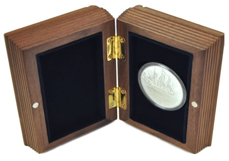 Each coin is presented in a wooden display case in the shape of a book and is accompanied by a numbered Certificate of Authenticity.