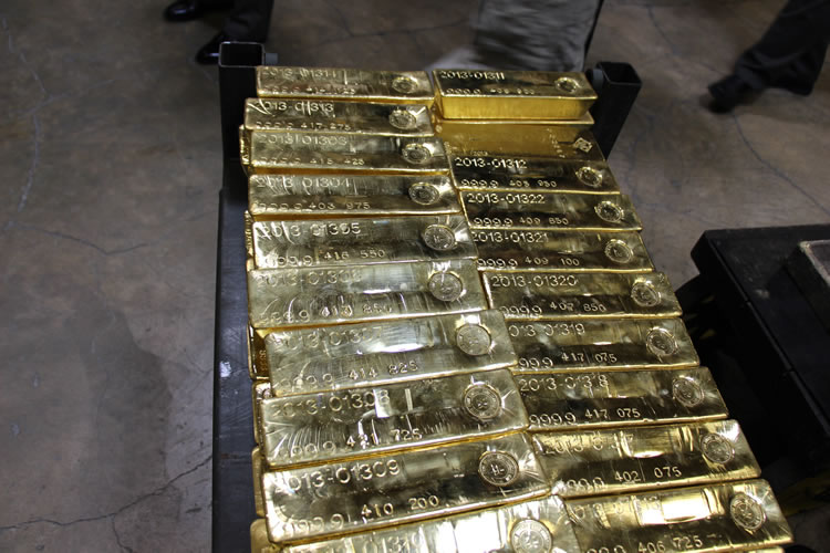 At 400 ounces a piece, or about 28 pounds per, the stacks of 99.99% pure gold bars make quite a picture. When visiting the West Point Mint on June 4, 2013, a single bar was worth almost $560,000.