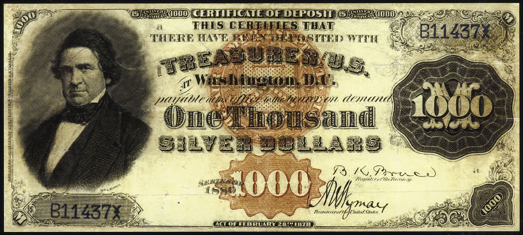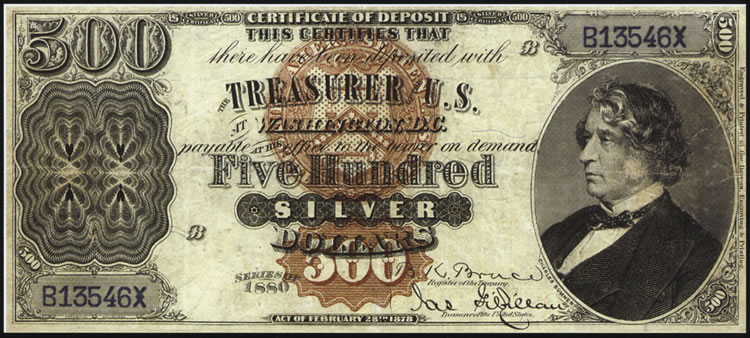 Large-size silver certificates started with the Series of 1878 and ended with the Series of 1923. The Bland-Allison Act of February 28, 1878, which created Morgan silver dollars, was also the genesis for Silver Certificates. A curious section in the legislation stipulated that Silver Certificates were not legal tender but could be exchanged for legal tender silver dollars. Silver Certificates of Deposit were soon printed.