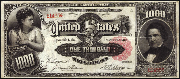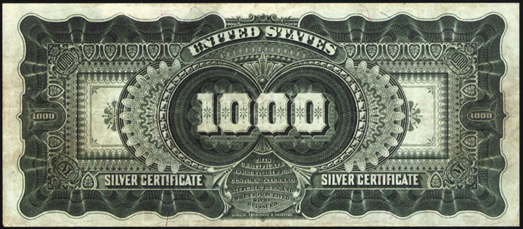 On the front and to the right of the note is a depiction of William L. Marcy, a U.S. Senator, the 11th Governor of New York and Cabinet member holding positions of Secretary of War and Secretary of State. On the back of the note are the boldly emblazoned words SILVER, CERTIFICATE, UNITED STATES and 1000.