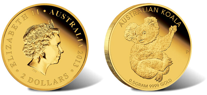 This coin is struck from one-half gram of 99.99% pure gold and features the likeness of a koala on its reverse.