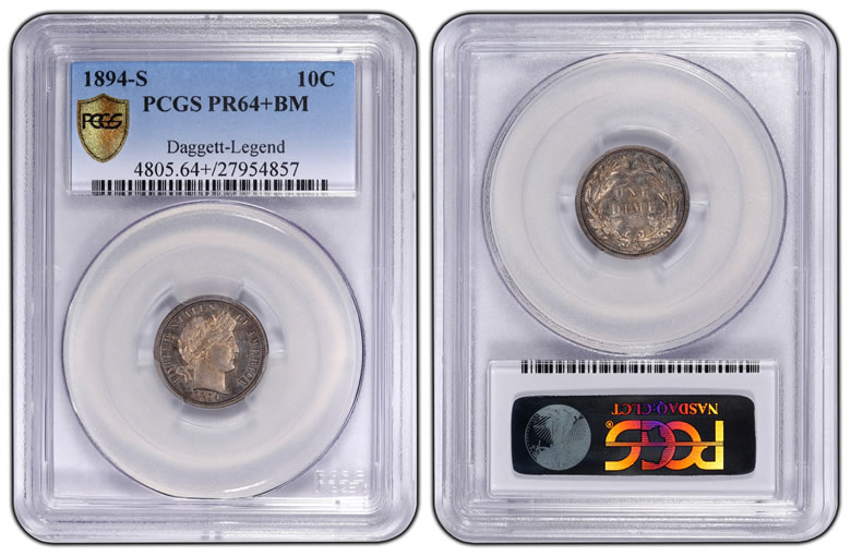 Just 24 proof dimes were minted at San Francisco in 1894. Ten (10) are confirmed to exist, with this coin likely the third finest known. The pedigree of this 1894-S Barber dime can be traced back to John Daggett, the San Francisco Mint superintendent responsible for producing the dimes.