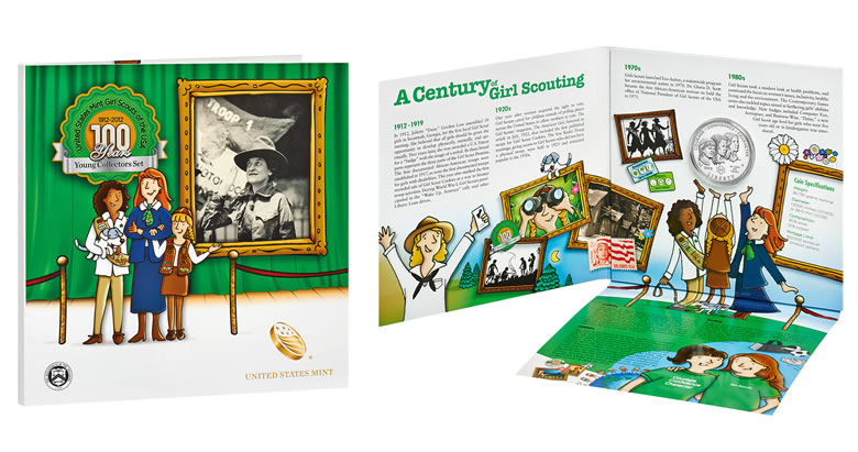 Each Girl Scouts of the USA Young Collectors Set has one of the uncirculated silver dollars in a tri-fold presentation folder with "Mint Kids" and other colorful characters who walk the reader through highlights and milestones of the organization’s first 100 years.