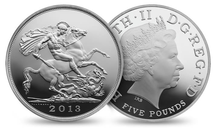 Struck in a proof finish especially for collectors, limited to 10,000 and priced at £80.00, the commemorative 2013 UK £5 Silver Proof Coin uniquely features the sovereign design that is traditionally restricted to gold coins.