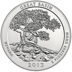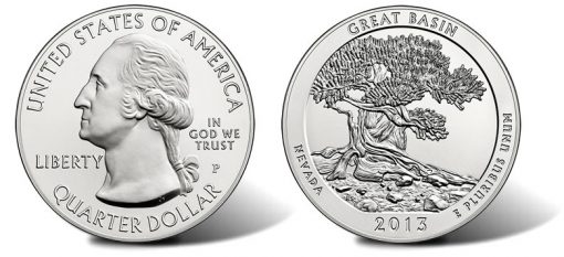 Though on a much larger scale, designs on the uncirculated coin are exactly the same as the companion Great Basin National Park Quarter which was sent into circulation beginning on June 10, 2013.