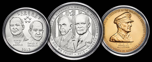 The 5-Star Generals Commemorative Coin Program was enacted to celebrate the 132nd anniversary of the founding of the Command and General Staff College in Fort Leavenworth, Kansas, as well as honor the lives and legacies of the five military Generals. A surcharge of $35 for each $5 gold coin, $10 for each silver dollar and $5 for each clad half-dollar sold will be collected and put towards the Command and General Staff College Foundation to help finance its support of the College.