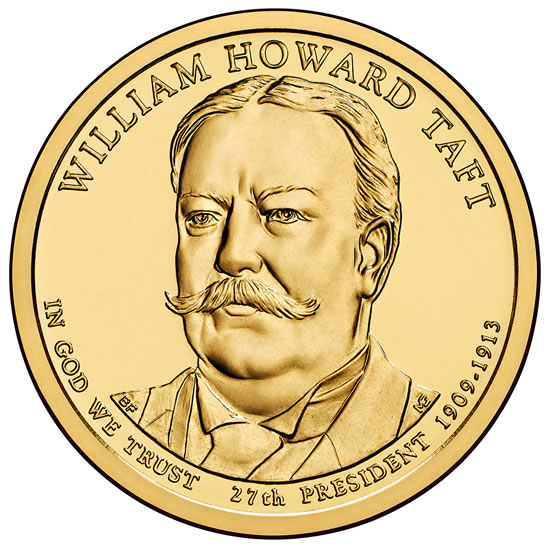 Inscriptions on this side of the coin read, "WILLIAM HOWARD TAFT," "IN GOD WE TRUST," "27th PRESIDENT" and "1909 – 1913."