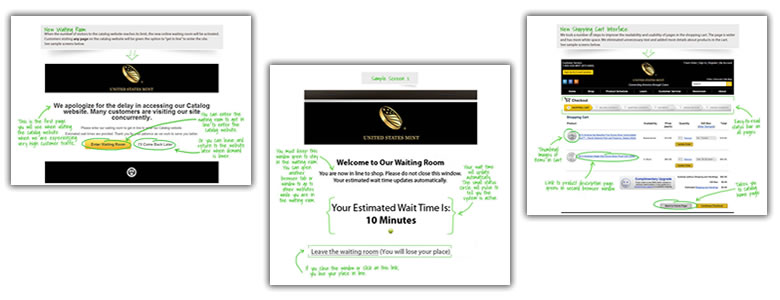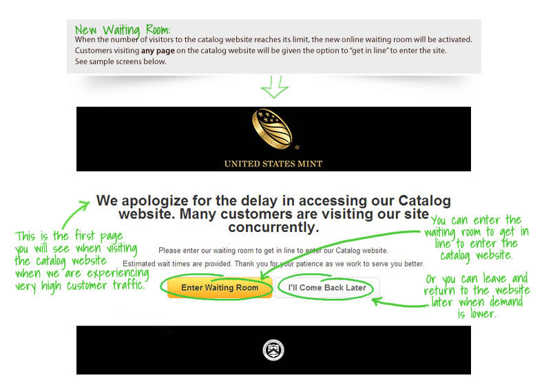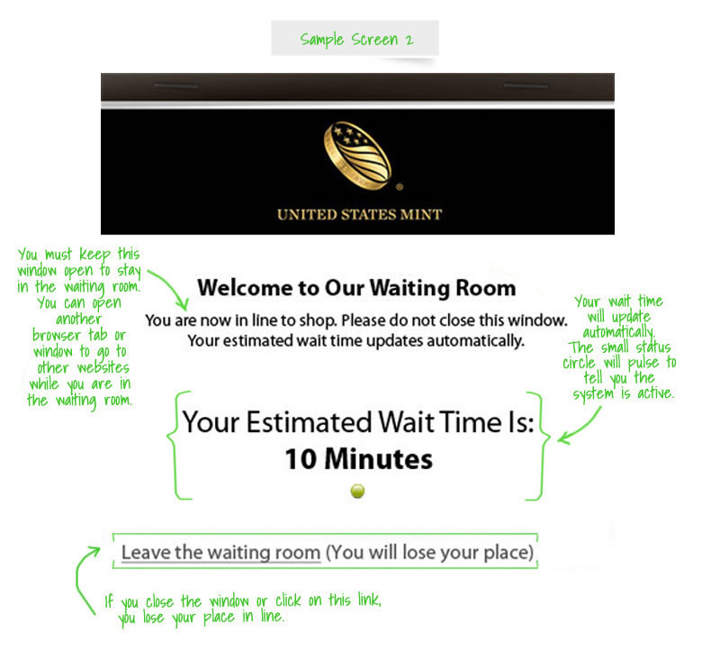 Anyone trying to visit the U.S. Mint’s online store during a peak period will have the option to return later or enter an online waiting room to "get in line." Once in the waiting room, a time is displayed that tells customers how long they have to wait before entering the online store.