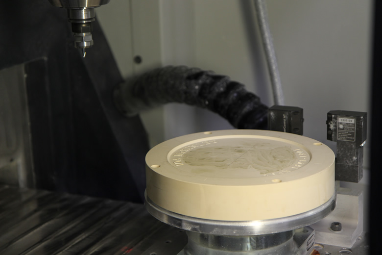 When they are approved, the scanned or digital data is sent to the Mikron CNC milling machine to mill a blank piece of steel into hubs and dies that are used to strike the coins or medals.