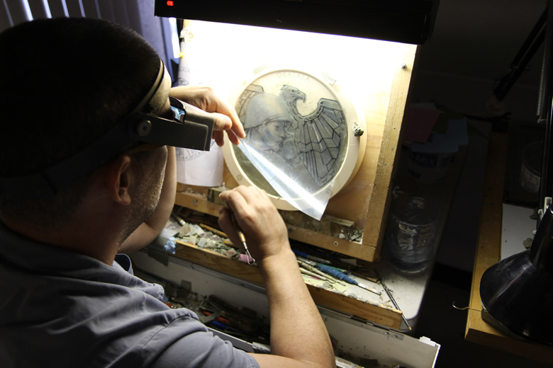 Final plaster models are digitally scanned and reduced to the actual coin or medal size. This process is completed with a high resolution scanner. Section by section, it digitally maps the hills and valleys of a plaster model with a sensitivity that can pick up finger prints. The millions of mapped data points are sent to digital design software for modifications and then to a CNC milling machine to cut the steel hubs and dies for production.