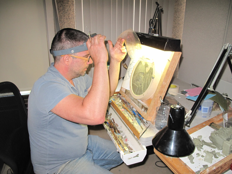 Mike showed us a nifty sculpting technique using a transparent overlay. It has a tracing of the sketch, and it’s taped to the top of the Ren basin. As a visual aide, Gaudioso flips the transparency up and down as he shapes the clay to a medal design in 3D.