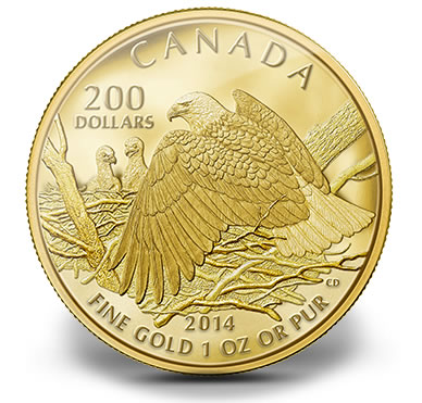 Gold coins feature reverses of a female bald eagle protecting her two young eaglets. The female adult is shown perched on the edge of her nest with wings slightly spread. Inscriptions read "CANADA," "200 DOLLARS," "2014," "FINE GOLD 1 OZ OR PUR" and the artist’s initials of CD.