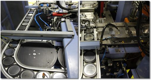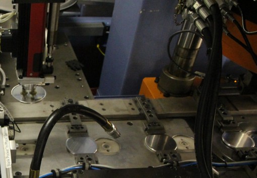 When the press needs a planchet to strike, a robotic arm with suction cups grabs one from the conveyor and places it into position.