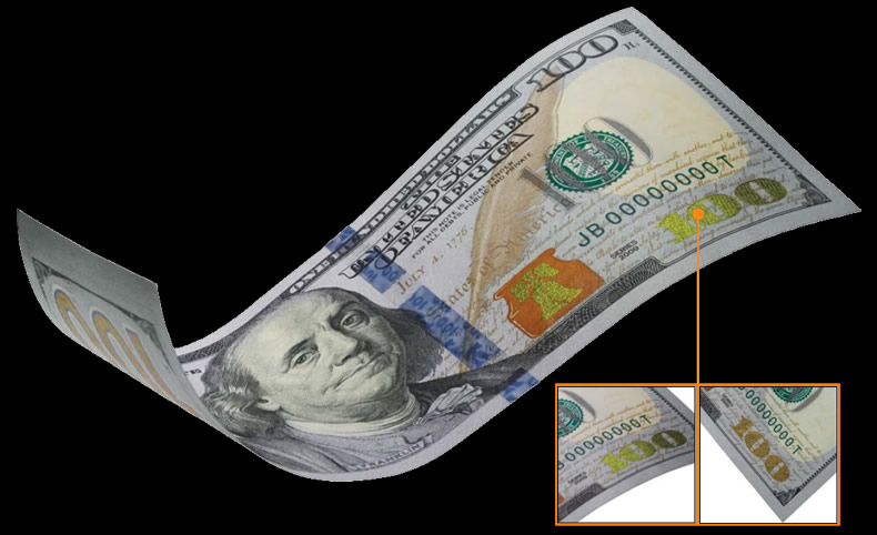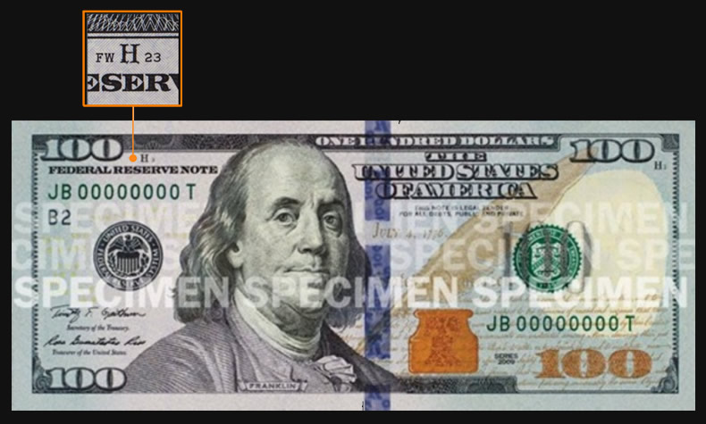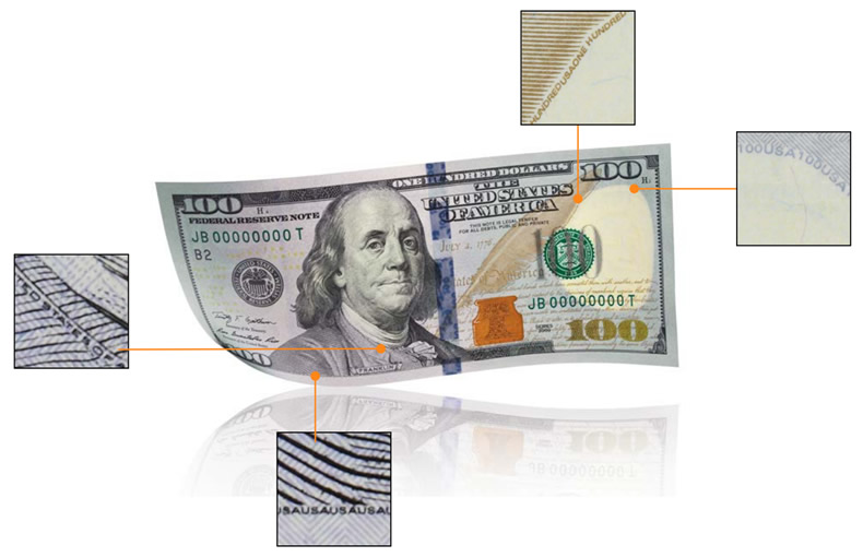 Microprinting of small words appear on the jacket collar of Benjamin Franklin’s portrait, around the blank space containing the watermark, along the golden quill and in the note borders. Corresponding words by these locations are ‘United States of America’, ‘USA 100’, and ‘ONE HUNDRED USA’.