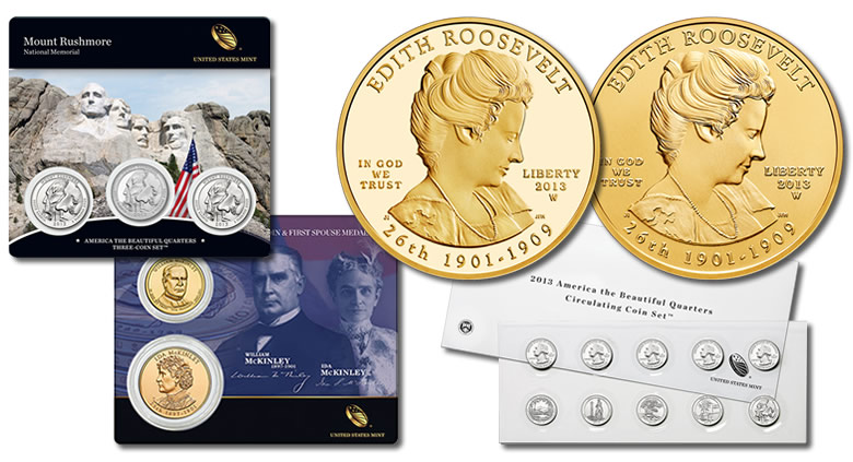 Next week the United States Mint will introduce its three-coin set of Mount Rushmore quarters, its McKinley 1$ Coin & Medal Set, a 10-coin set of 2013 America the Beautiful Quarters in circulating quality and Edith Roosevelt First Spouse Gold Coins.