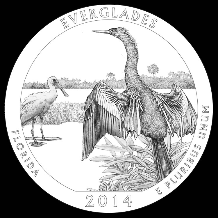 Two water birds are shown on the reverse design of the Everglades National Park quarter and five ounce silver coins. An anhinga in the foreground is depicted with outstretched wings on a willow tree while a roseate spoonbill is further in the distance. Reverse inscriptions include EVERGLADES, FLORIDA, 2014 and E PLURIBUS UNUM.