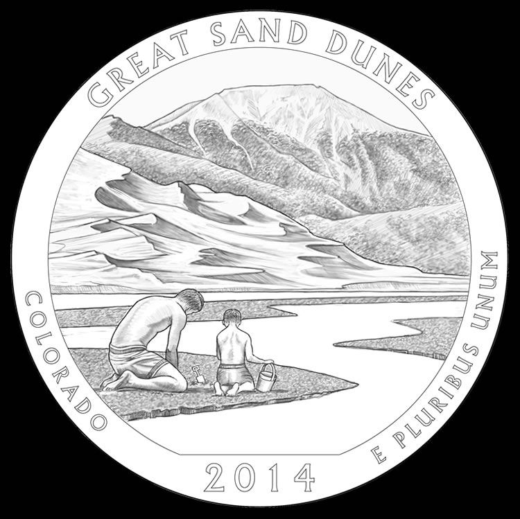 For Great Sand Dunes National Park quarters and five ounce silver coins, a father and son are shown playing in the sand next to a creek bed. In the background, the mountains and sand dunes of the region appear. Inscriptions surrounding the design include GREAT SAND DUNES, COLORADO, 2014 and E PLURIBUS UNUM.