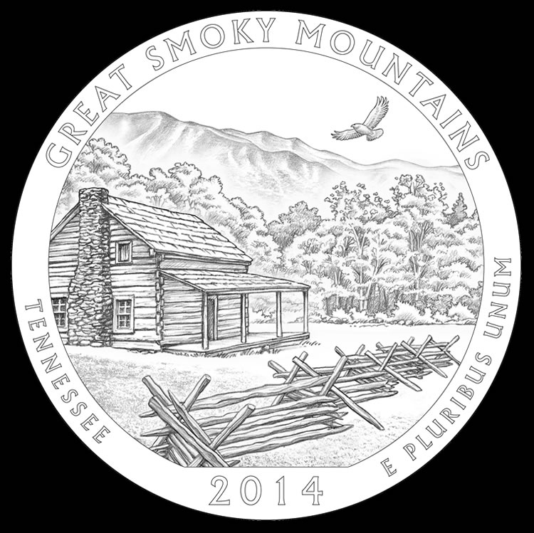 Central to the reverse of the quarters and coins is a historic log cabin found within the boundaries of the Great Smoky Mountains National Park. A hawk is seen circling above. A lush green forest of the region is in the backdrop. Inscriptions surrounding the design include GREAT SMOKY MOUNTAINS, TENNESSEE, 2014 and E PLURIBUS UNUM.